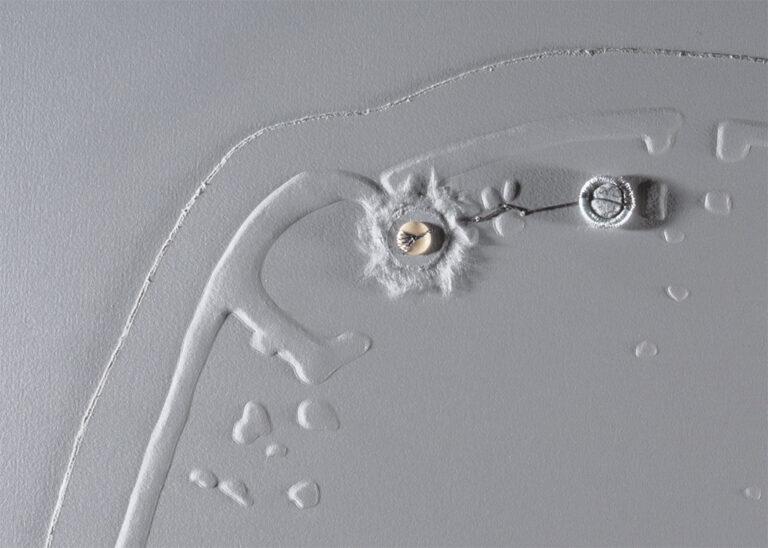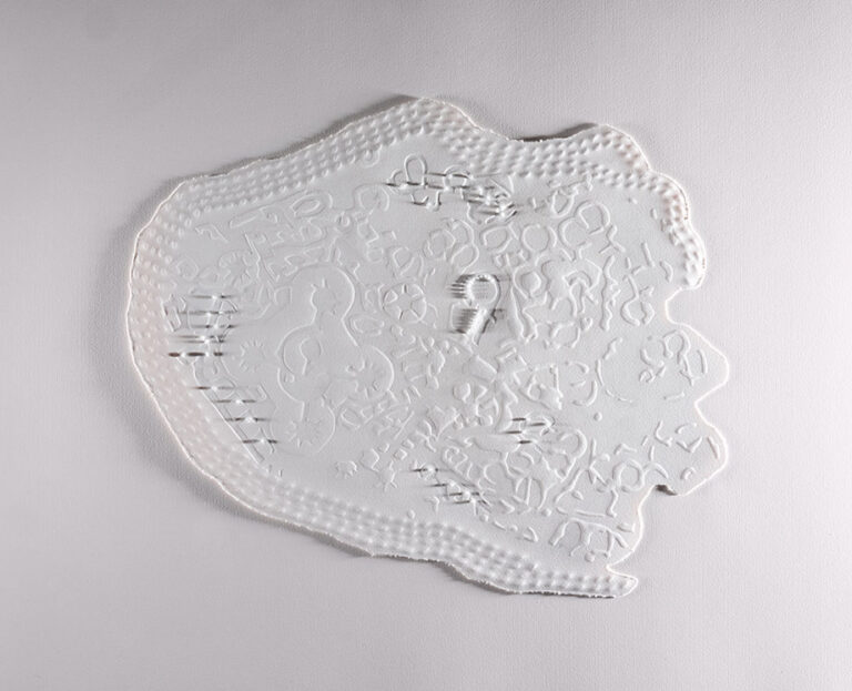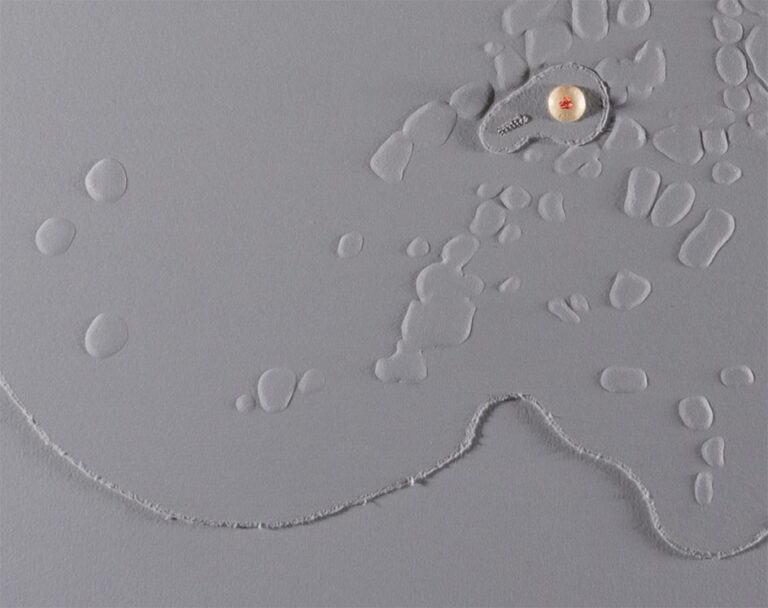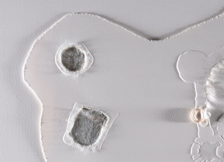 The project fuses the sites of pre-literate civilization using a site footprint as a starting point and in combination with twenty-first century texts that grapple with the erasure of cultural traditions. The forms for “Mother-tongue” are based on several sites, called nuraghe, built on the island of Sardinia between 1900-730 BCE. In its collage imagery, “Mother-tongue” incorporates handwritten facsimiles of the poetry of Sardinian writer Antonella Anedda (1955- ) printed on transparent paper. Anedda writes in Italian and Lugodorese, derived from Latin with incorporated elements of Byzantine Greek, Catalan and Castilian. I bind the embossed paper to these words with silk thread, fusing ancient protectorates to the contemporary pluralities of Sardinia’s geography and language.